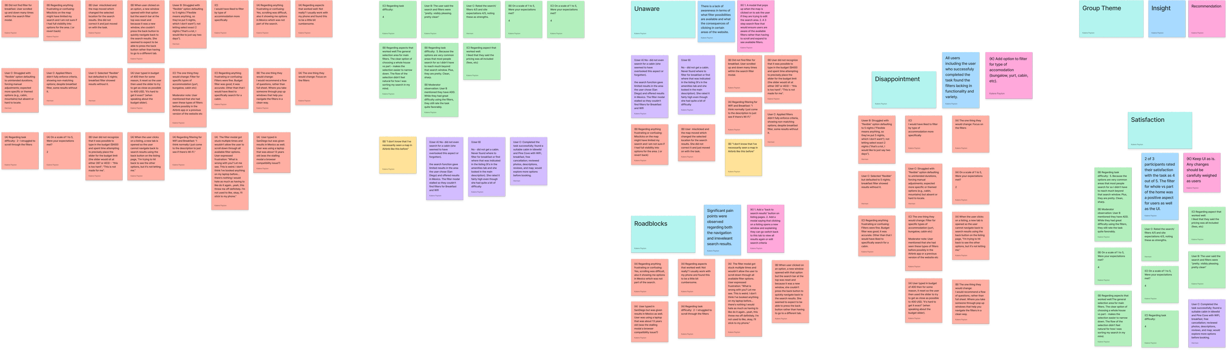 User A: Filter modal stalled; irrelevant Mexico results; frustration with budget slider.