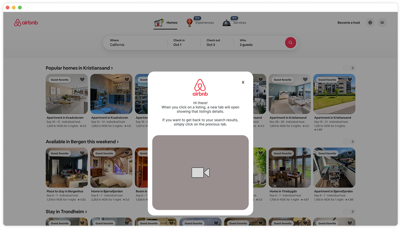 Add a modal on search results explaining that listings open in new tabs, with a looped tutorial video.