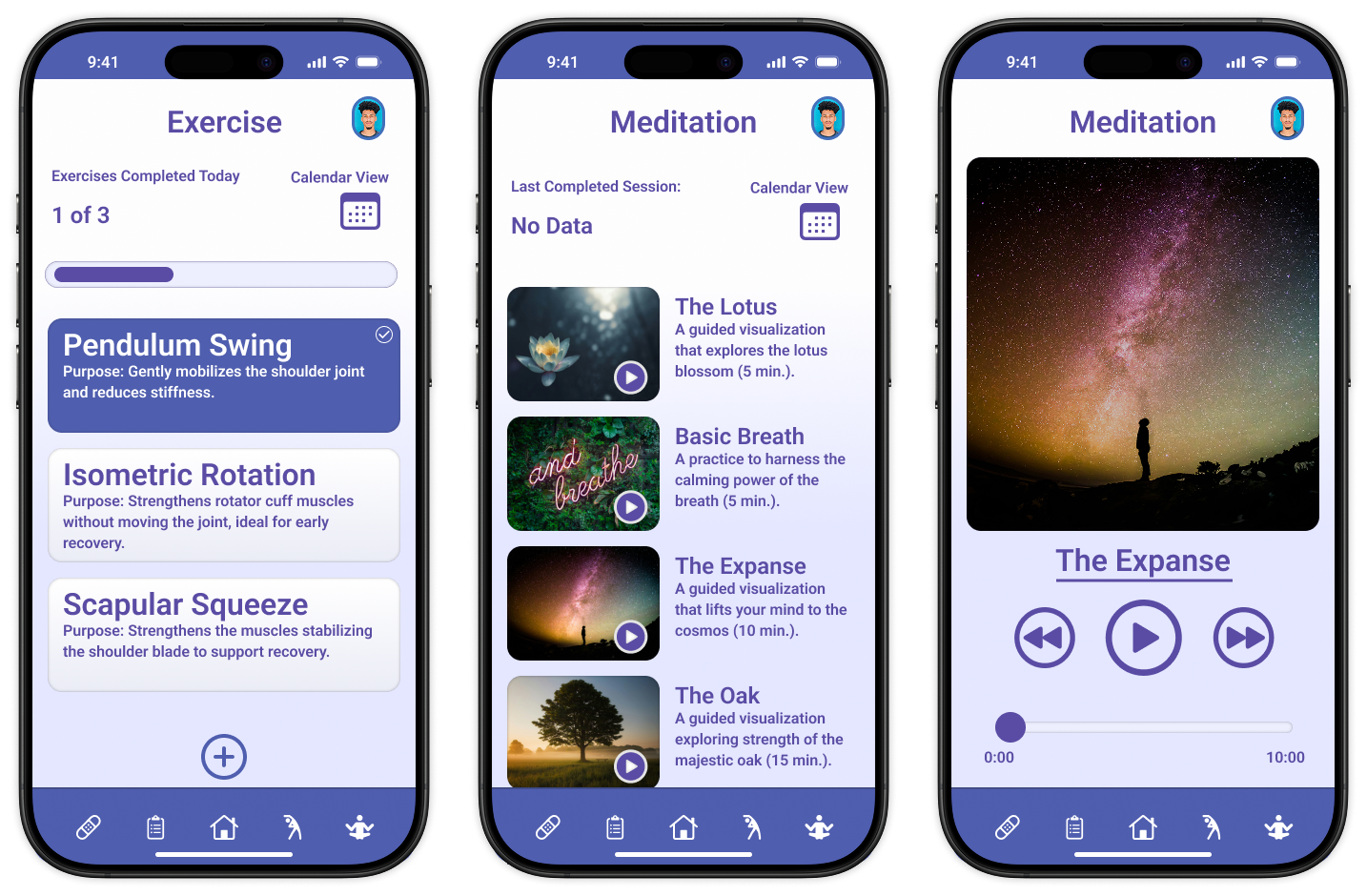 Audio-guided sessions (e.g., Basic Breath, The Expanse) with playback controls and completion logs.