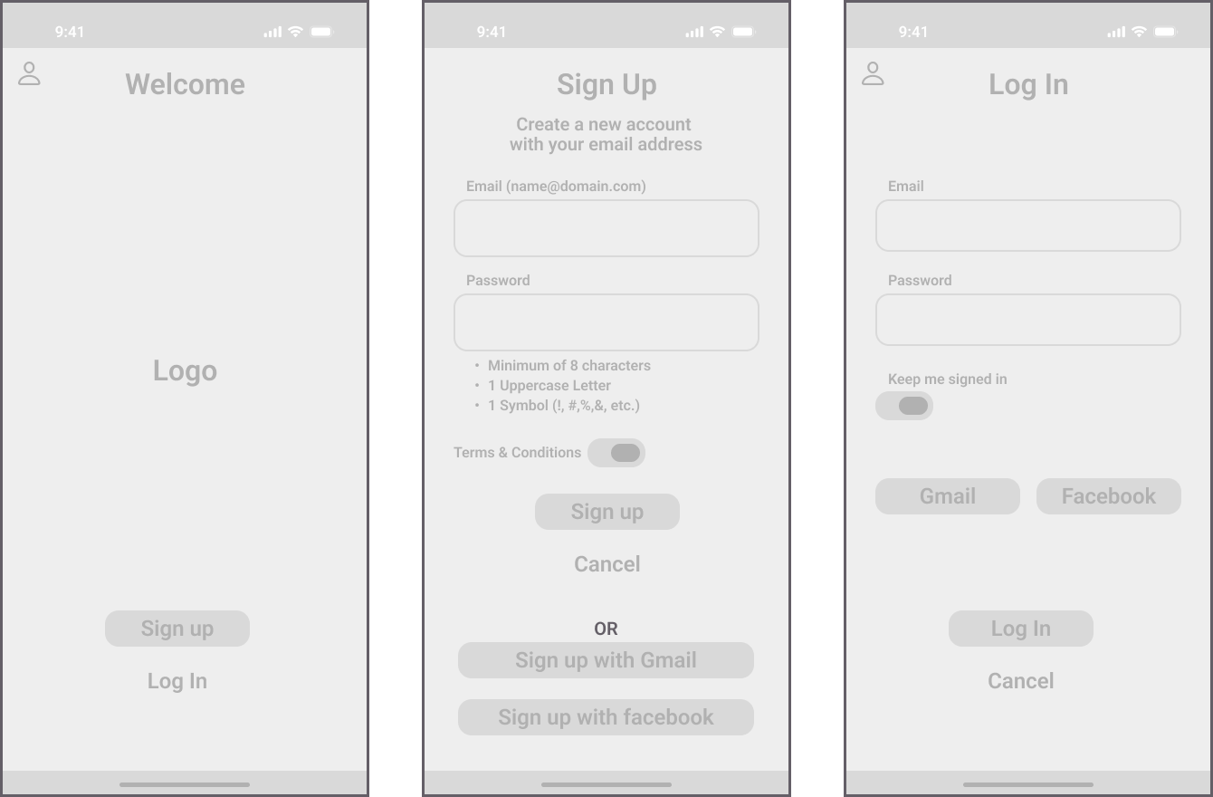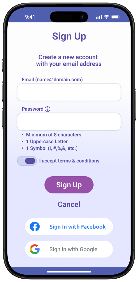 Streamlined sign-up/login with error modals and social options (Google, Facebook).