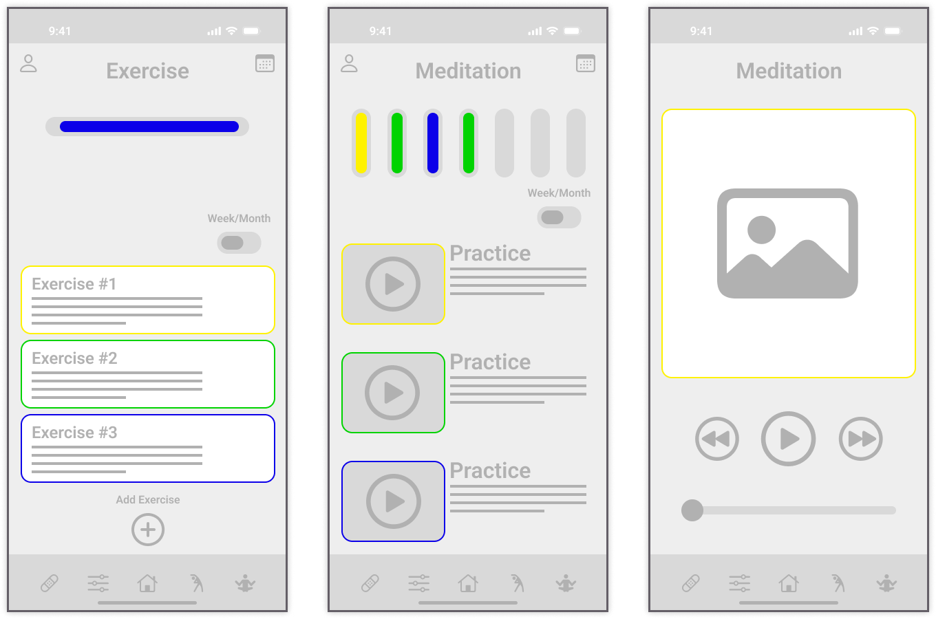 User-added exercises with sets/reps/time; expandable cards for details and completion marking, plus progress bar.